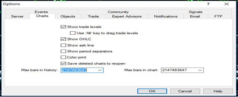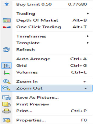 To zoom in or out, select the chart you want to view, right click and choose ‘Zoom In’ or ‘Zoom Out’ option. Alternatively, from the main toolbar you can use the magnifying glass icons to zoom in and out.