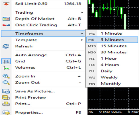 Alternatively, the time frame can be changed by right clicking on the chart, selecting Timeframes then your preferred option.