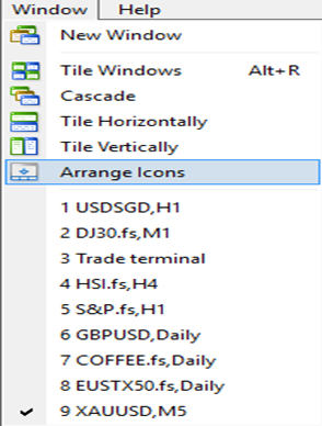 • To create a more personalised layout, select the ‘Windows’ dropdown from the toolbar to display the different options for arranging charts, or use the ‘Arrange Icons’ to size each individual chart.